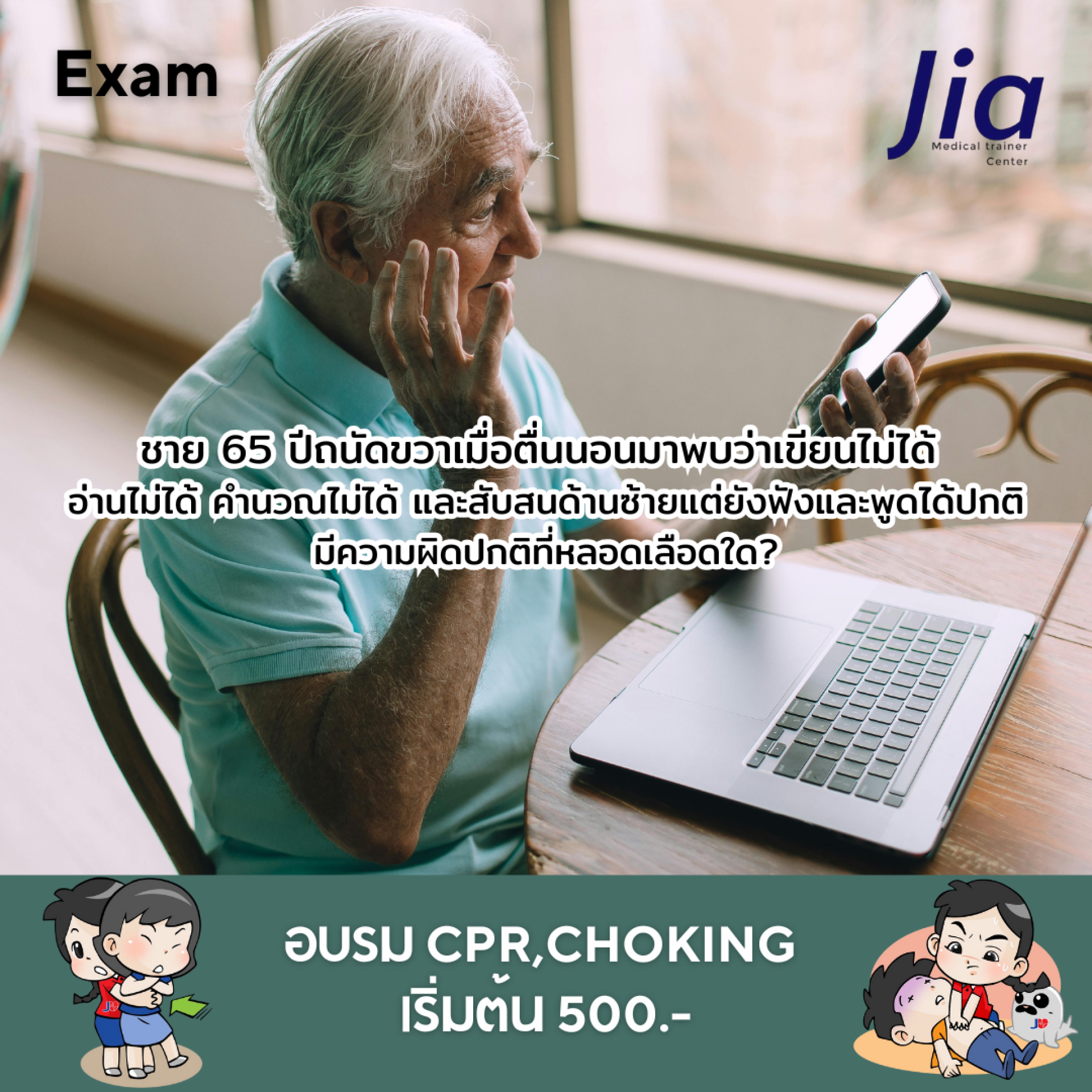 ชาย 65 ปี ถนัดขวา เมื่อตื่นนอนมาพบว่าเขียนไม่ได้ อ่านไม่ได้ ค านวณไม่ได้ และสับสนด้านซ้าย แต่ยังฟังและพูดได้ ปกติ มีความผิดปกติที่หลอดเลือดใด?