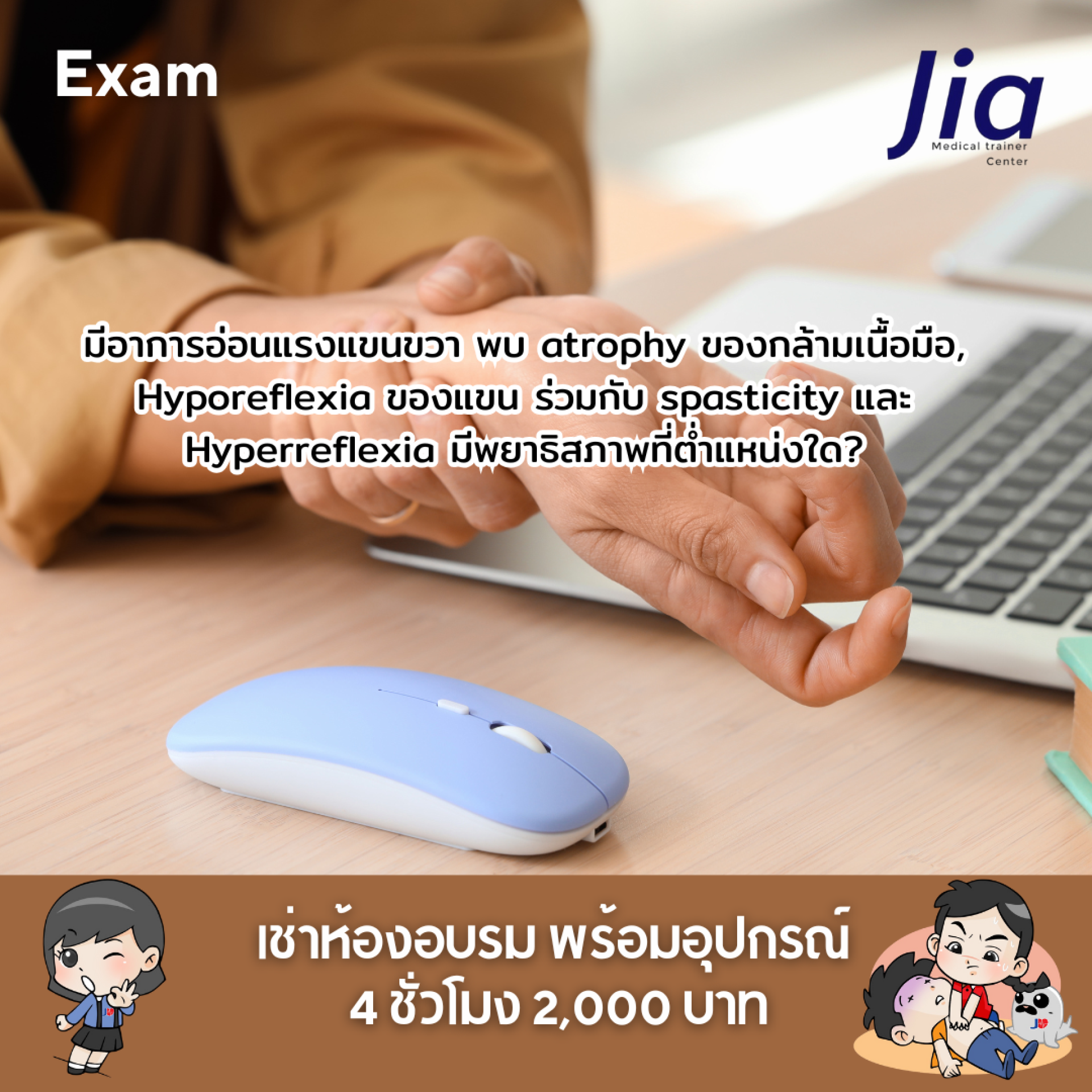 การบาดเจ็บที่ Anterior horn cell ด้านขวา ทำให้แขนขวาแสดงอาการ LMN (atrophy, hyporeflexia)