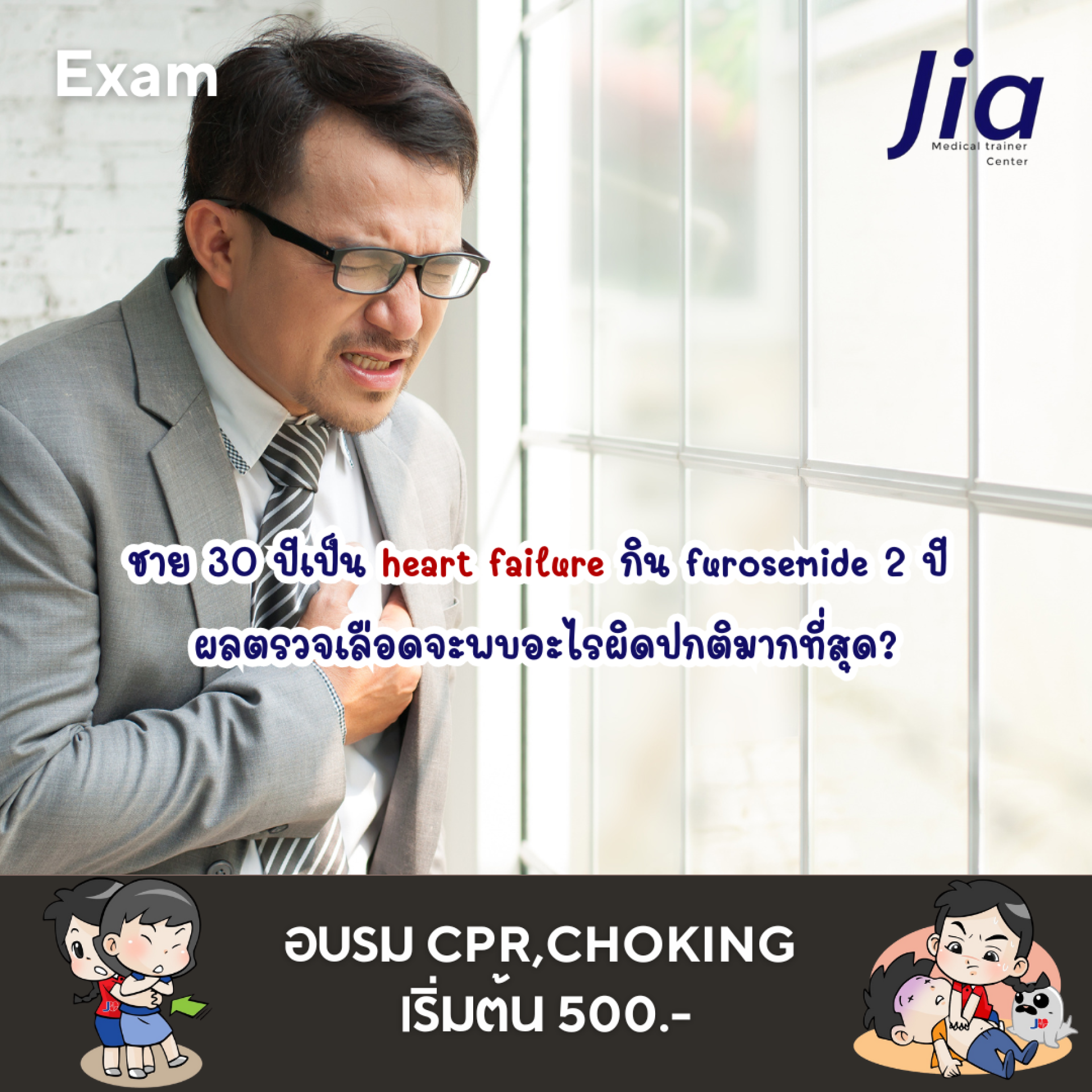 ชาย 30 ปี เป็น heart failure กิน furosemide 2 ปี ผลตรวจเลือดจะพบอะไรผิดปกติมากที่สุด?
