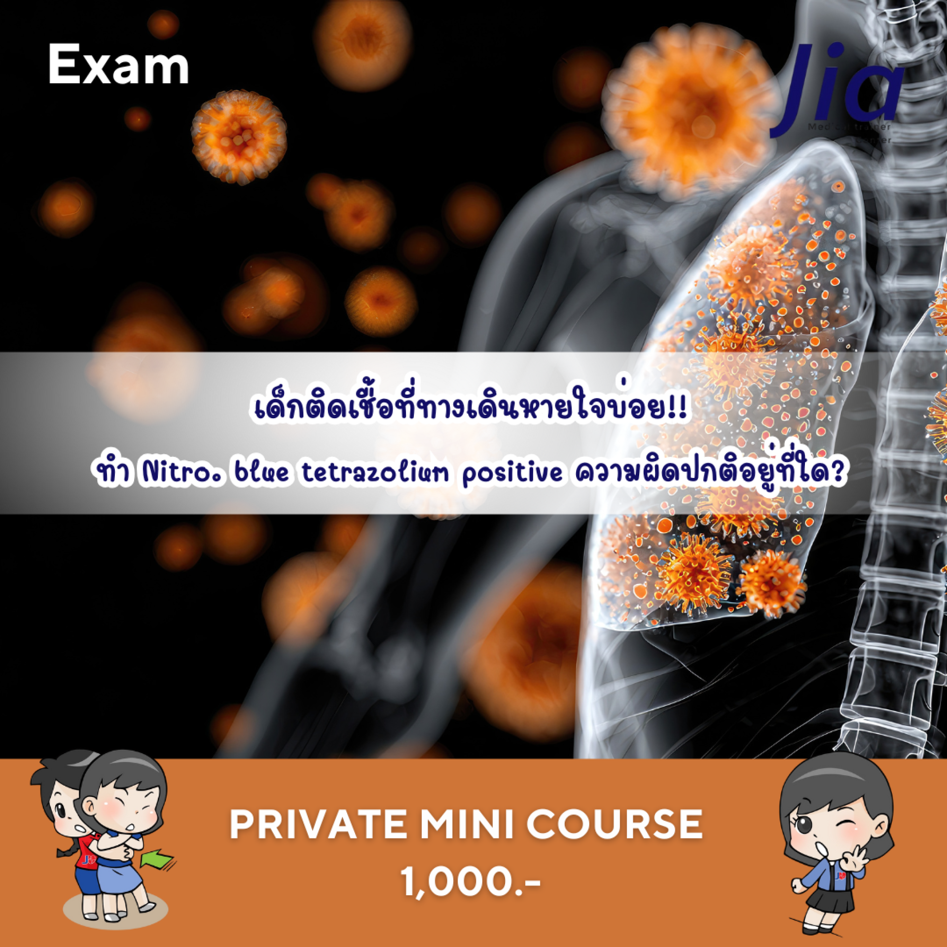 เมื่อพิจารณาจากประวัติการติดเชื้อบ่อย ร่วมกับผล NBT test ที่เป็นบวก (ปกติ) ภาวะที่อาจเป็นไปได้และตรงกับตัวเลือกมากที่สุดคือ Myeloperoxidase deficiency เพราะเป็นความผิดปกติของ neutrophil ที่พบบ่อยและทำให้ประสิทธิภาพการฆ่าเชื้อลดลง ขณะที่การสร้าง ROS ยังปกติ (NBT positive) อย่างไรก็ตาม ในบางครั้งคำถามอาจต้องการทดสอบความรู้เรื่อง CGD ซึ่ง NBT จะเป็นลบ แต่เนื่องจากโจทย์ระบุว่า NBT positive จึงต้องเลือกข้อที่อธิบายการติดเชื้อบ่อยโดยที่ NBT ยังปกติ ซึ่งก็คือ ความผิดปกติของ myeloperoxidase