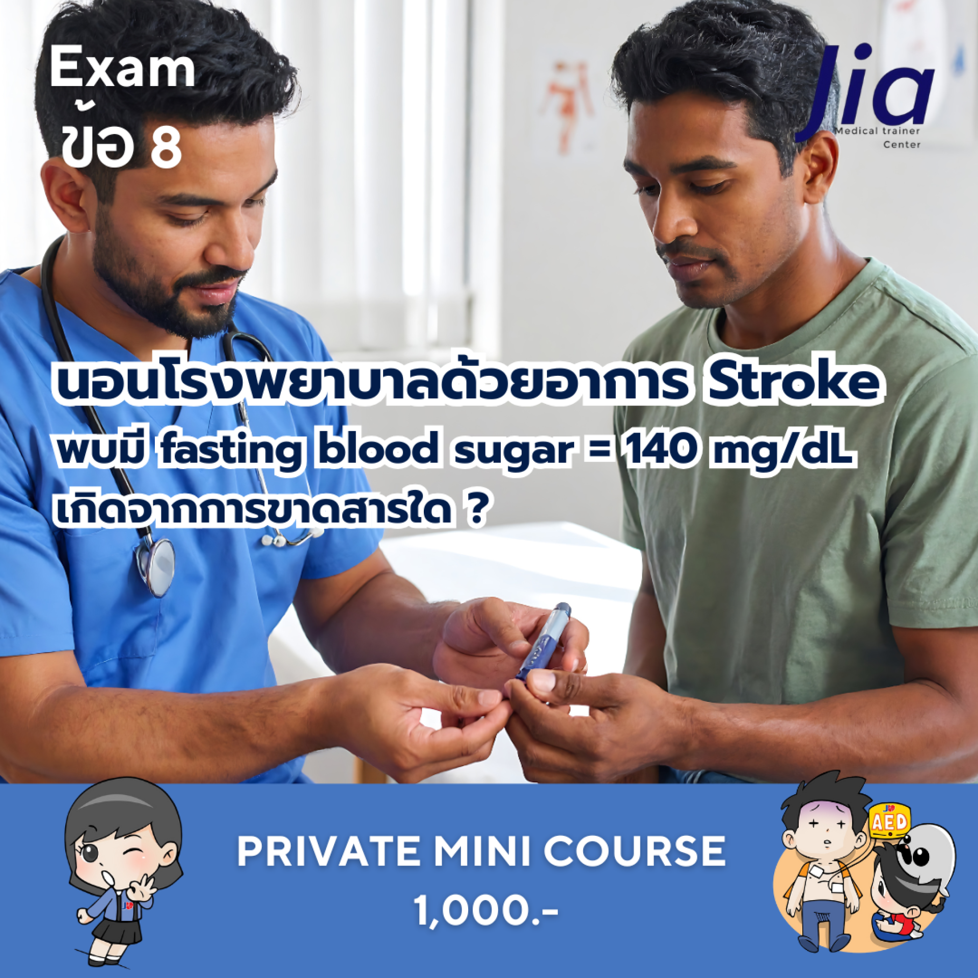 ผู้ป่วยมีประวัติ Stroke (โรคหลอดเลือดสมอง) และปัจจุบันมีภาวะ น้ำตาลในเลือดสูงขณะอดอาหาร (Fasting blood sugar = 140 mg/dL ซึ่งอยู่ในเกณฑ์ "Impaired Fasting Glucose" หรืออาจเป็นเบาหวานได้) หลังจากนอนโรงพยาบาลมา 6 เดือน