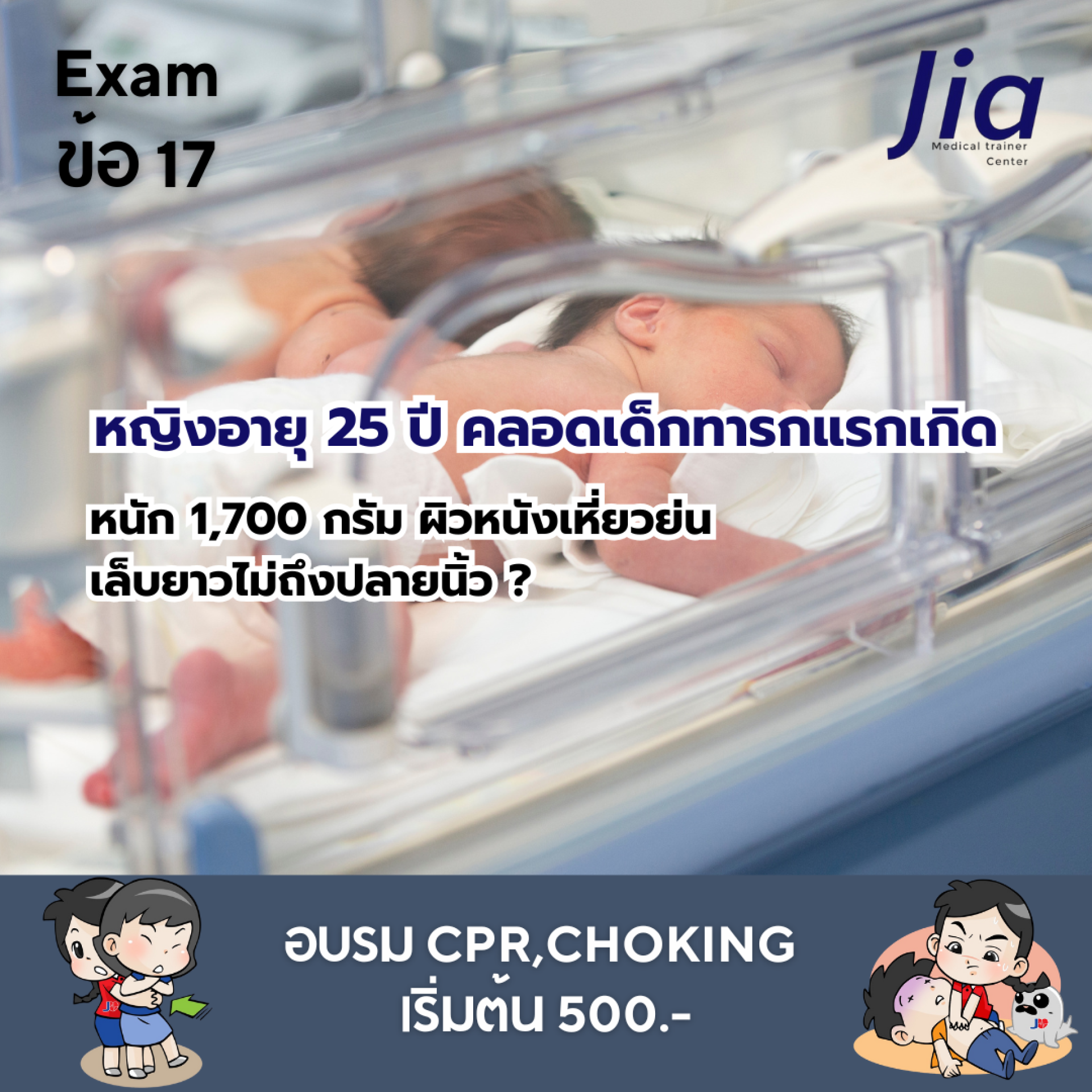 ลักษณะทางคลินิกที่บอกว่าทารกไม่เล็กมาก (ไม่ใช่ extreme prematurity): ผิวหนังเหี่ยวย่น (Wrinkled skin): พบในทารกคลอดก่อนกำหนด แต่ไม่ใช่ทารกที่เล็กมาก (เช่น < 28 สัปดาห์) เพราะทารกที่เล็กมากมักมีผิวบางใส มีขนอ่อน (lanugo) มาก เล็บยาวไม่ถึงปลายนิ้ว: ในทารกครบกำหนดเล็บจะยาวถึงหรือเลยปลายนิ้ว ดังนั้นการที่เล็บยังไม่ถึงปลายนิ้ว บ่งชี้ว่าอายุครรภ์ยังไม่ครบกำหนด (ก่อน 38 สัปดาห์) อัณฑะยังไม่ลงถุง (undescended testis): อัณฑะจะลงถุงประมาณอายุครรภ์ 32-36 สัปดาห์ ดังนั้นการที่ยังคลำไม่พบก็สอดคล้องกับอายุครรภ์ประมาณ 34 สัปดาห์ เมื่อรวมข้อมูลทั้งหมด (โดยเฉพาะ CRL 28 ซม.) อายุครรภ์ที่น่าจะเป็นคือ 34 สัปดาห์