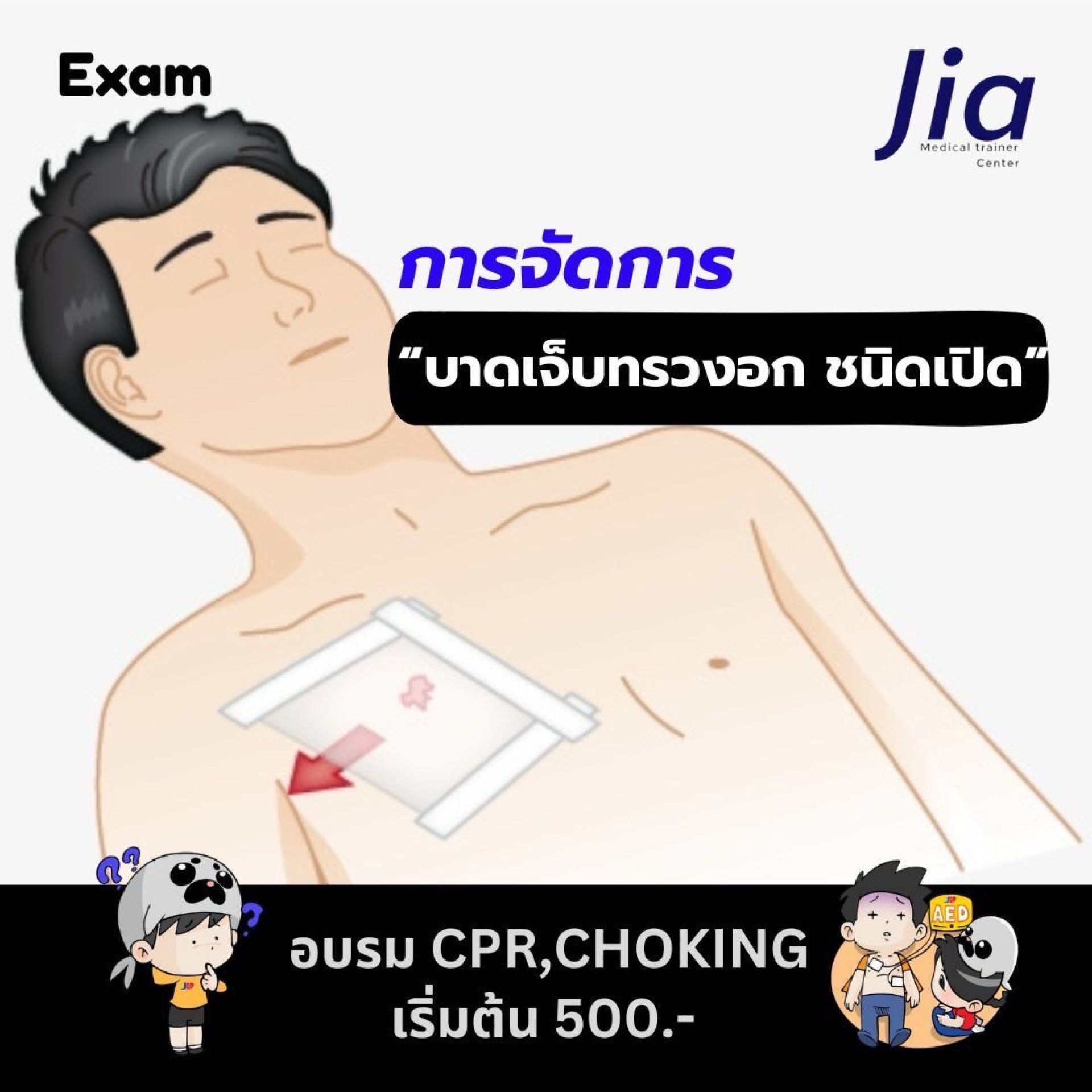 จากการประเมินผู้ป่วยอายุ 42 ปี ที่ประสบอุบัติเหตุรถจักรยานยนต์และมีแผลเปิดขนาด 3.5 เซนติเมตรที่ผนังหน้าอกด้านขวาพร้อมกับมีอากาศรั่ว ได้ยินเสียงหายใจลดลงที่ปอดขวา และมีระดับออกซิเจนในเลือดต่ำอยู่ที่ 90 เปอร์เซ็นต์ ชุดอาการนี้บ่งชี้อย่างชัดเจนถึงภาวะบาดเจ็บทรวงอกชนิดเปิดซึ่งเป็นภาวะฉุกเฉินที่คุกคามชีวิต