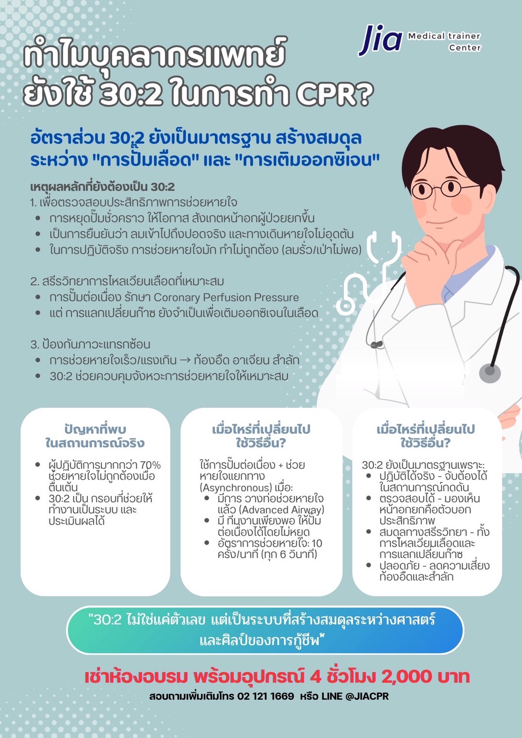 อัตราส่วน 30:2 ไม่ได้เป็นแค่ตัวเลขที่กำหนดขึ้นมา แต่เป็น จุดสมดุลทางคลินิก (Clinical Trade-off) ที่พิจารณาจากพยาธิสรีรศาสตร์ การศึกษาเชิงผลลัพธ์ และความเป็นไปได้ในการปฏิบัติงานจริง โดยให้ความสำคัญสูงสุดกับการรักษาการไหลเวียนเลือดผ่านการกดหน้าอกที่ต่อเนื่องและมีคุณภาพเป็นหลัก ในขณะเดียวกันก็จัดสรรเวลาช่วงสั้นๆ ที่จำเป็นสำหรับการเติมออกซิเจนและขับ CO2 ซึ่งสามารถตรวจสอบประสิทธิภาพได้ผ่านการสังเกตการยกตัวของหน้าอก เพื่อป้องกันไม่ให้การช่วยหายใจที่ไม่มีประสิทธิภาพกลายเป็นปัจจัยลบต่อการรอดชีวิต