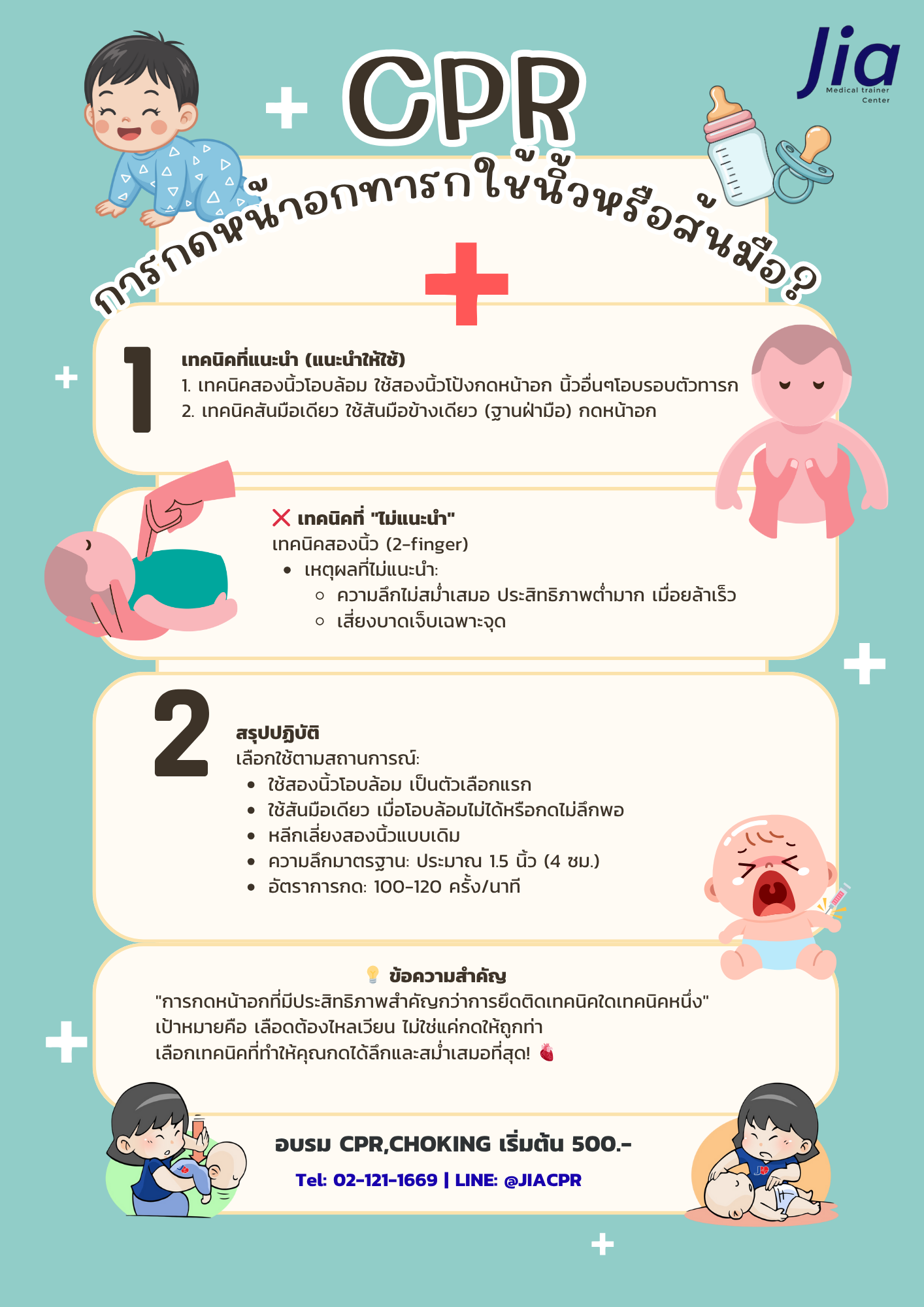 เหตุผล: มีการศึกษาจริงในสถานพยาบาลพบว่าเทคนิคนี้ให้ ความลึกของการกดได้มากกว่า เทคนิคสองนิ้วโอบล้อม