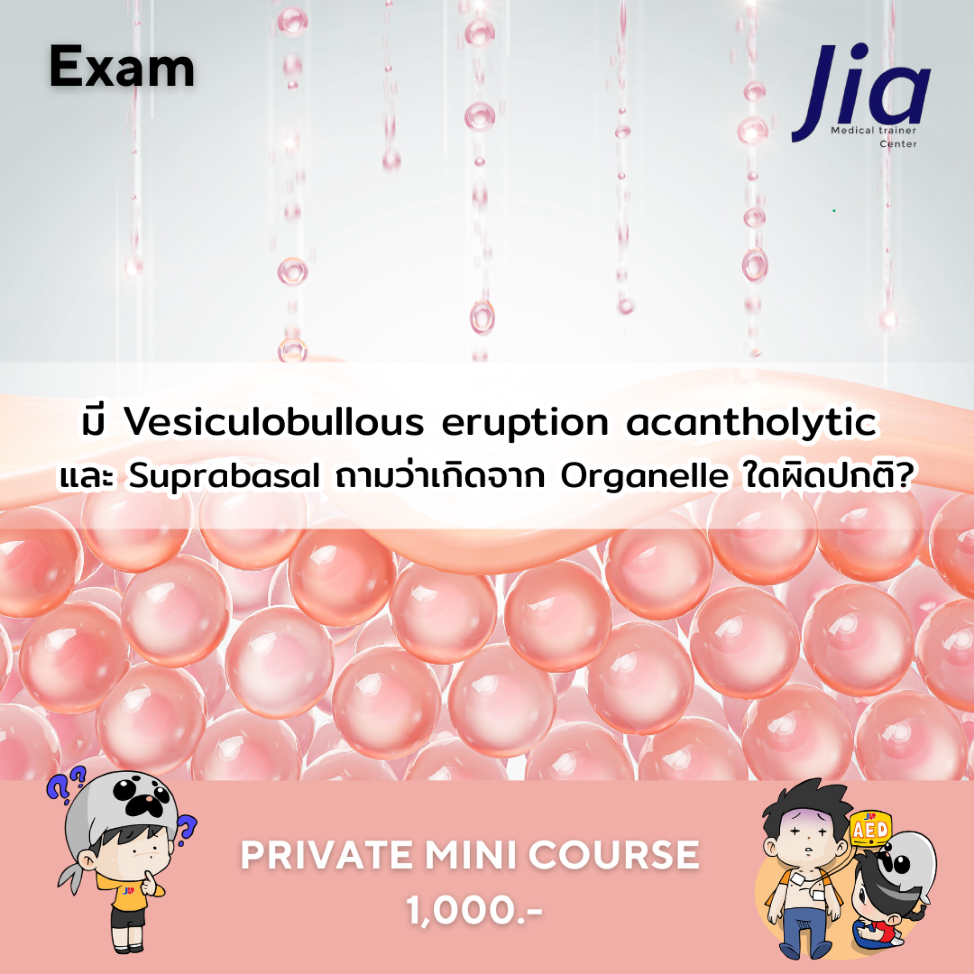 มี Vesiculobullous eruption acantholytic และ Suprabasal ถามว่าเกิดจาก Organelle ใดผิดปกติ?