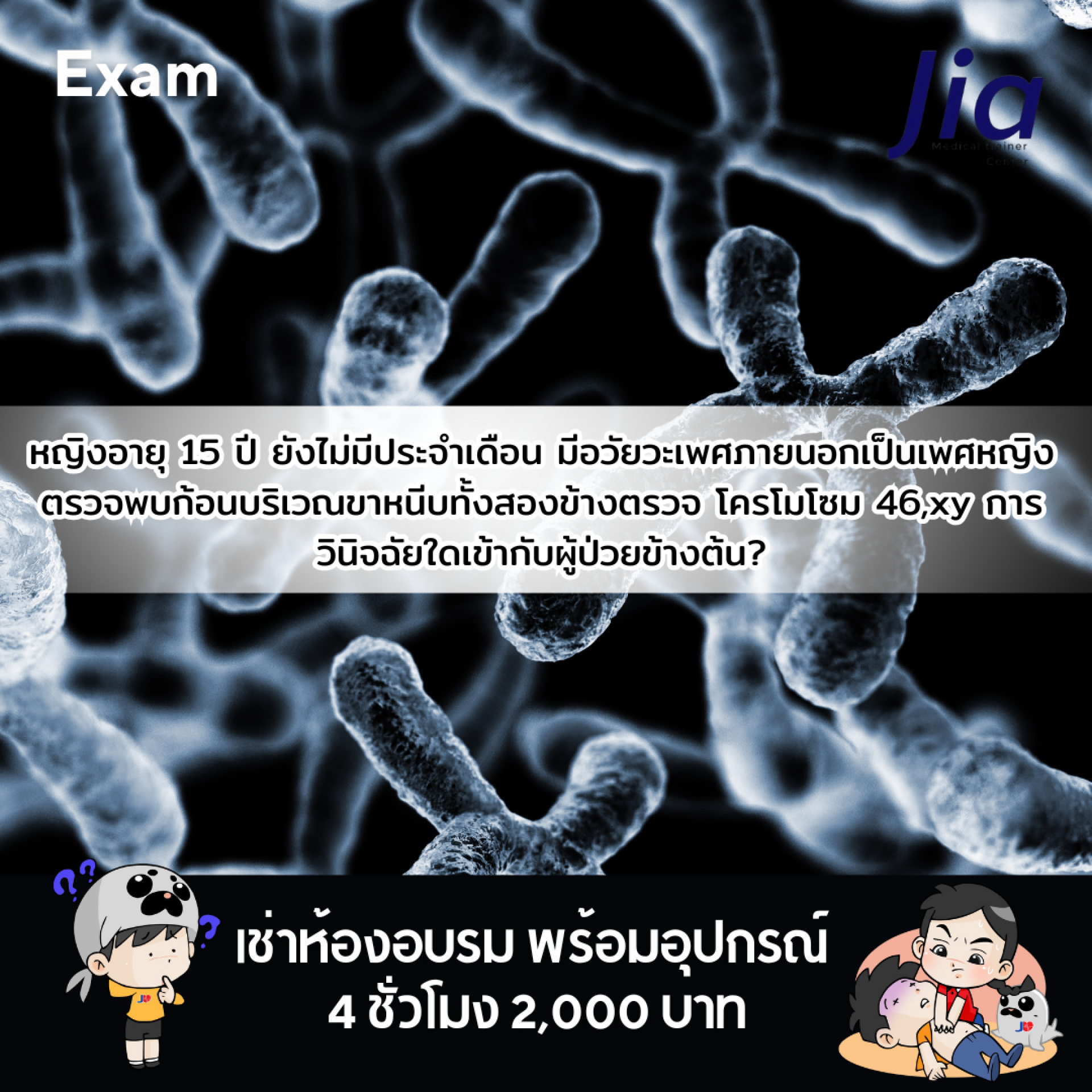 หญิงอายุ 15 ปี ยังไม่มีประจำเดือน มีอวัยวะเพศภายนอกเป็นเพศหญิง ตรวจพบก้อนบริเวณขาหนีบทั้งสองข้างตรวจ โครโมโซม 46,xy การวินิจฉัยใดเข้ากับผู้ป่วยข้างต้น?