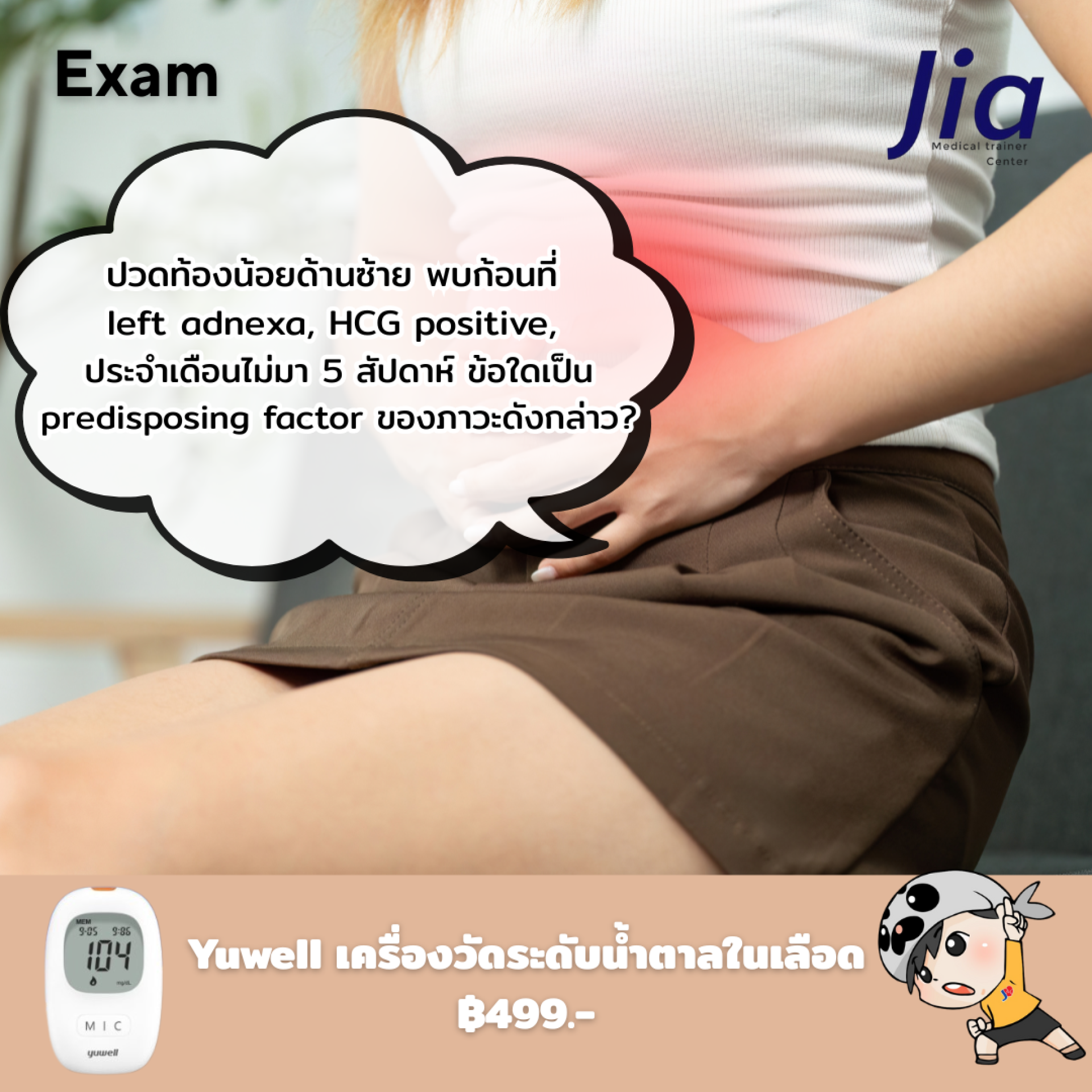 ผู้ป่วยเป็นหญิงวัยเจริญพันธุ์ อาการปวดท้องน้อยด้านซ้าย มีก้อนที่ left adnexa, hCG บวก (ตั้งครรภ์) ประจำเดือนขาด 5 สัปดาห์ สงสัยภาวะ การตั้งครรภ์นอกมดลูก (ectopic pregnancy) ที่ท่อนำไข่ด้านซ้าย